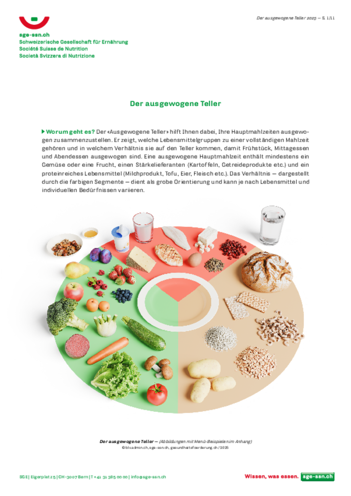 Der neue ausgewogene Teller (Langversion / Kurzversion) zeigt auf einfache Weise, wie eine ausgewogene Hauptmahlzeit zusammengestellt werden kann – unabhängig vom Lebensstil oder den Ernährungsgewohnheiten. Er ergänzt die Schweizer Ernährungsempfehlungen 2024 und dient Fachpersonen, Kantonen und Programmen als praxisnahes Instrument zur Förderung einer ausgewogenen Ernährung. Mehr zum ausgewogenen Teller auf ausgewogener-teller.ch.