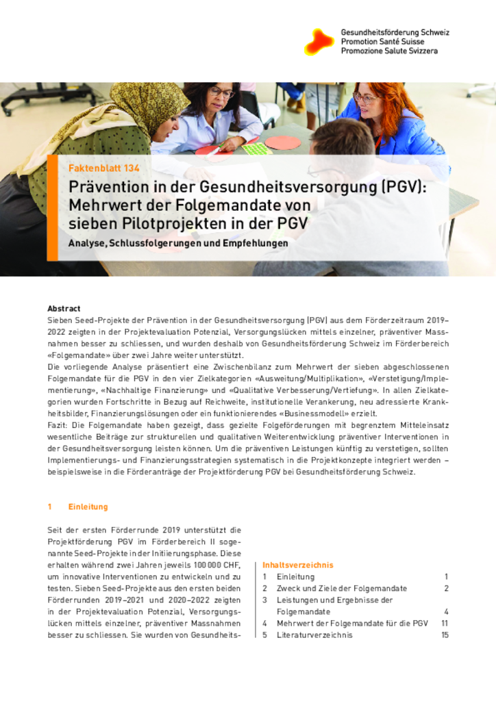 Link kopieren Faktenblatt 134 12.03.2026 Prävention in der Gesundheitsversorgung (PGV): Mehrwert der Folgemandate von sieben Pilotprojekten in der PGV Deutsch Französisch Link kopieren