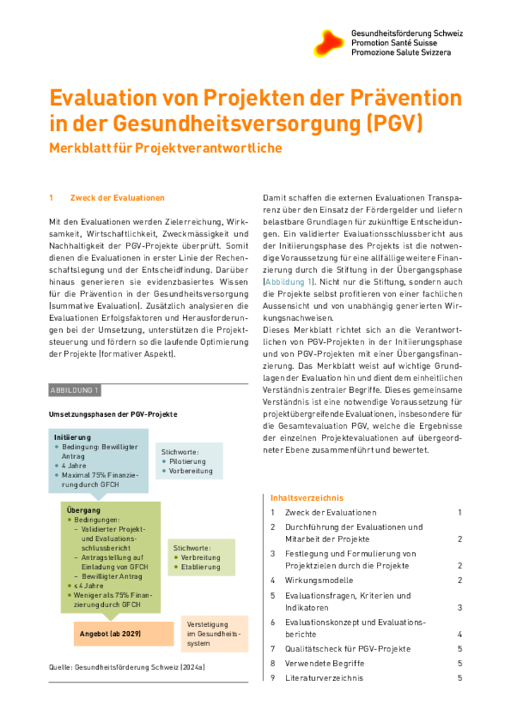 Prävention in der Gesundheitsversorgung (PGV) Publikationen Pfadnavigation Startseite Prävention in der Gesundheitsversorgung Themen und Publikationen Publikationen Neuste Publikationen Infoblatt 12.03.2026 Evaluation von Projekten der Prävention in der Gesundheitsversorgung (PGV) Link kopieren Infoblatt 12.03.2026 Evaluation von Projekten der Prävention in der Gesundheitsversorgung (PGV) Deutsch Französisch Link kopieren Faktenblatt 134 12.03.2026 Prävention in der Gesundheitsversorgung (PGV): Mehrwert der Folgemandate von sieben Pilotprojekten in der PGV Link kopieren Faktenblatt 134 12.03.2026 Prävention in der Gesundheitsversorgung (PGV): Mehrwert der Folgemandate von sieben Pilotprojekten in der PGV Deutsch Französisch Link kopieren Broschüre 04.12.2025 Selbstmanagement-Förderung; acht Eckpfeiler zur Orientierung für Gesundheitsfachpersonen Link kopieren Broschüre 04.12.2025 Selbstmanagement-Förderung; acht Eckpfeiler zur Orientierung für Gesundheitsfachpersonen Deutsch Französisch Italienisch Link kopieren Filter anzeigen - Alle -EvaluationMonitoringEmpfehlungen / Leitfaden / Umsetzungshilfe Inhaltstyp Evaluation Monitoring Empfehlungen / Leitfaden / Umsetzungshilfe - Alle -BerichtArbeitspapierFaktenblattBroschüreInfoblattFlyerPolicy BriefQR-Code-TeaserChecklisteInfografikBuch Publikationstyp Bericht Arbeitspapier Faktenblatt Broschüre Infoblatt Flyer Policy Brief QR-Code-Teaser Checkliste Infografik Buch - Alle -DeutschFranzösischItalienischEnglisch Sprache(n) Deutsch Französisch Italienisch Englisch Ergebnisse sortieren nach Thema sortiert chronologisch sortiert Prävention in der Gesundheitsversorgung (PGV) Grundlagen der Projektförderung 11 Projektförderung 8 Evaluation der geförderten Projekte 88 Weitere Dokumente 20 Gesundheitsförderung und Prävention allgemein Autonomie 8 Gesundheitskompetenz 6 Nationale Strategie zur Prävention nichtübertragbarer Krankheiten (NCD-Strategie) 16 Wirkung der Gesundheitsförderung und Prävention 4 Weitere Dokumente 3