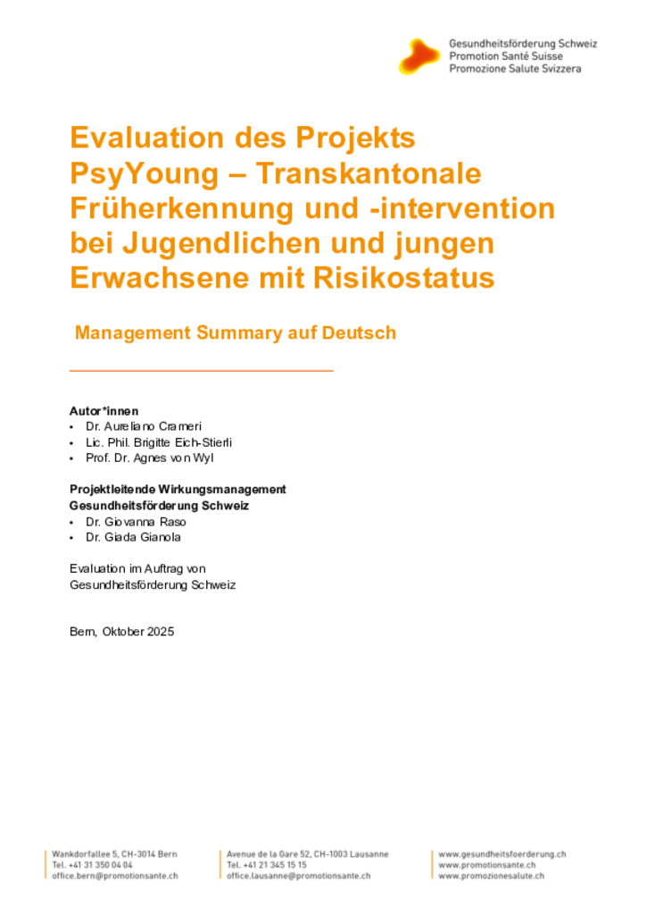 Link kopieren Management Summary 27.10.2025 Evaluation des Projekts PsyYoung – Transkantonale Früherkennung und -intervention bei Jugendlichen und jungen Erwachsene mit Risikostatus Deutsch Französisch Italienisch Link kopieren